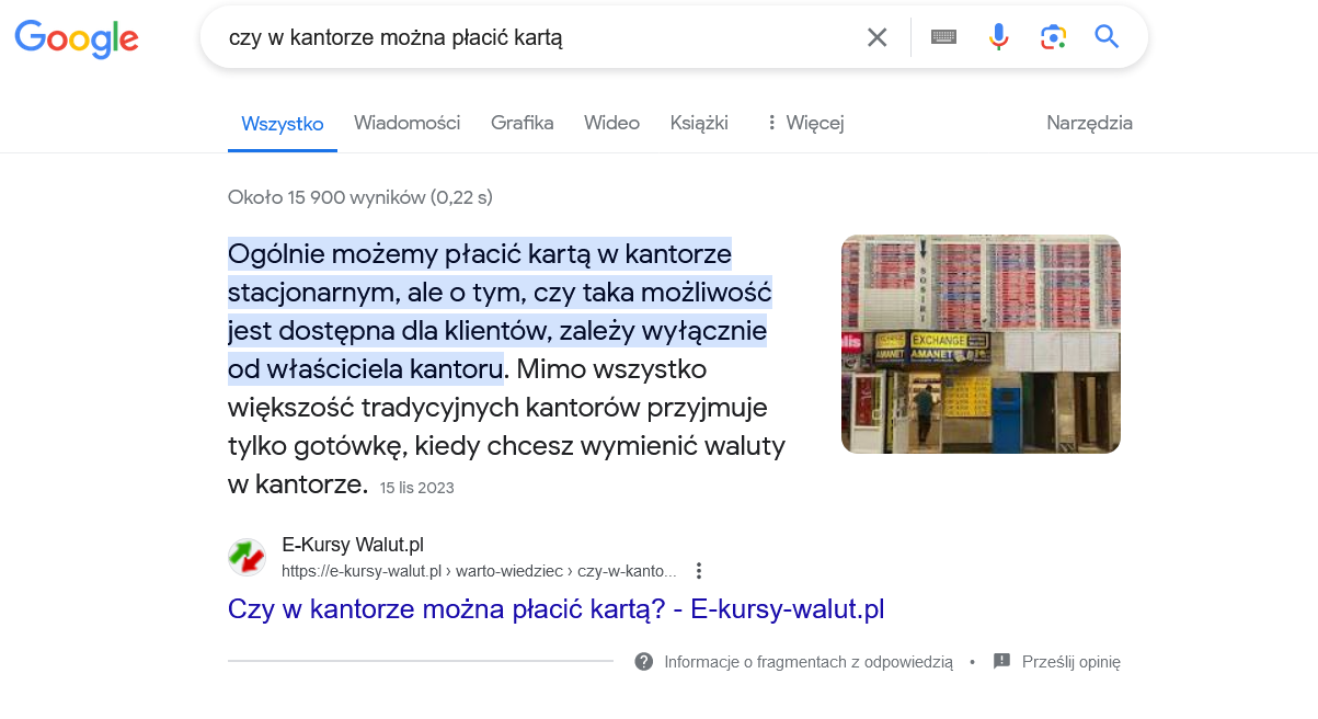 Dzięki tym działaniom i dopasowaniem pytań pod wyszukiwarkę artykuł zajął pierwsze miejsce na frazę "czy w kantorze można płacić kartą".